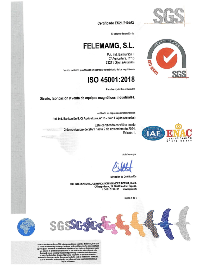 FELEMAMG ha obtenido la certificación ISO 45001 -para los próximos 3 años- por el diseño, fabricación y venta de equipos magnéticos industriales.