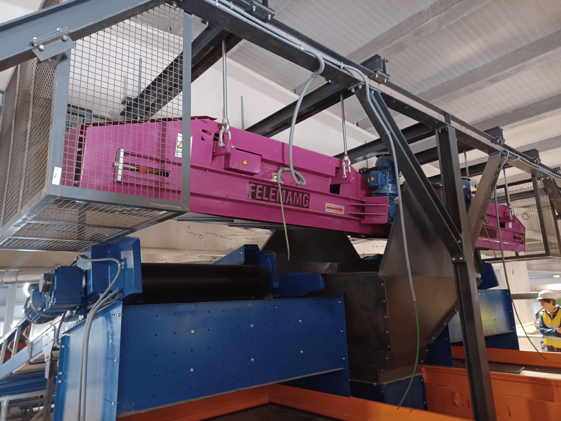 Se han instalado 5 separadores magnéticos Overband, tipos SF2-RC, colocados de forma transversal a la cinta para la separación de férricos seguidos de 5 separadores tipo SFME, para la separación de metales no férricos por corrientes de Foucault.